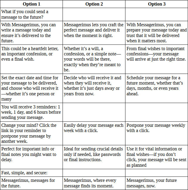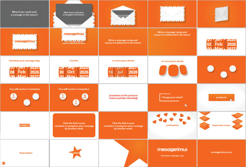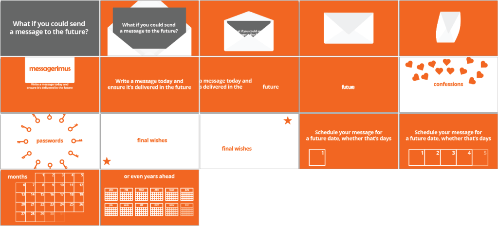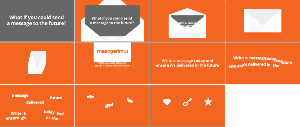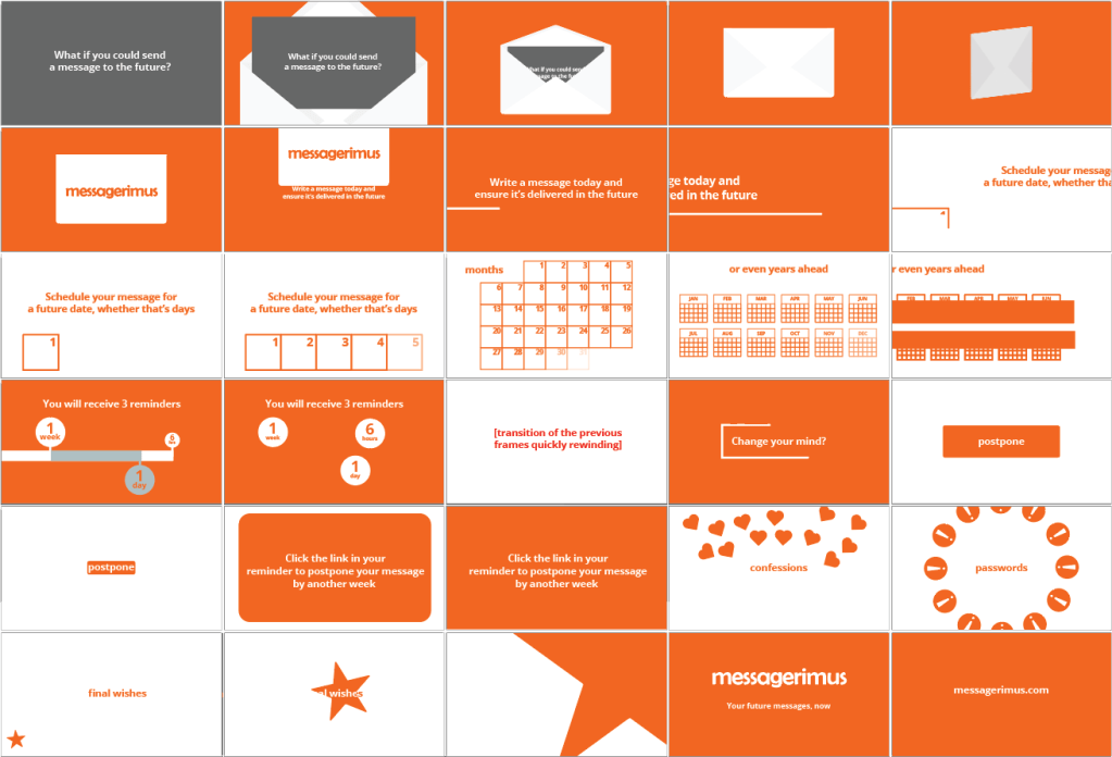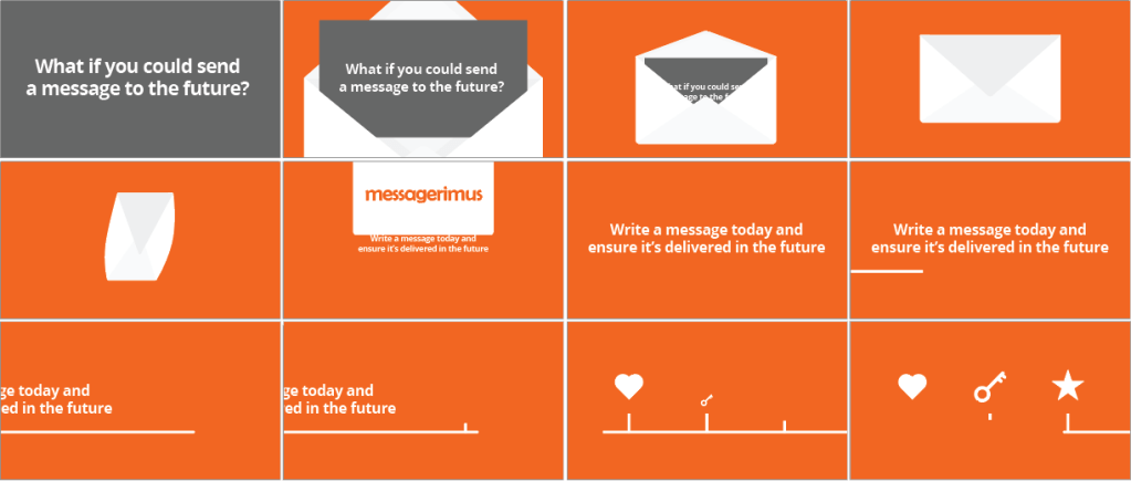 The Messagerimus website allows users to send an email at a future date of their choosing, with a few different settings for how they can do so. In order to explain the process, they provided a a series of images at the top of the page that users could watch, and you can see that GIF beside this text. However, they wanted a video to explain it in a more visually appealing way for their users, and you can see the final video above.