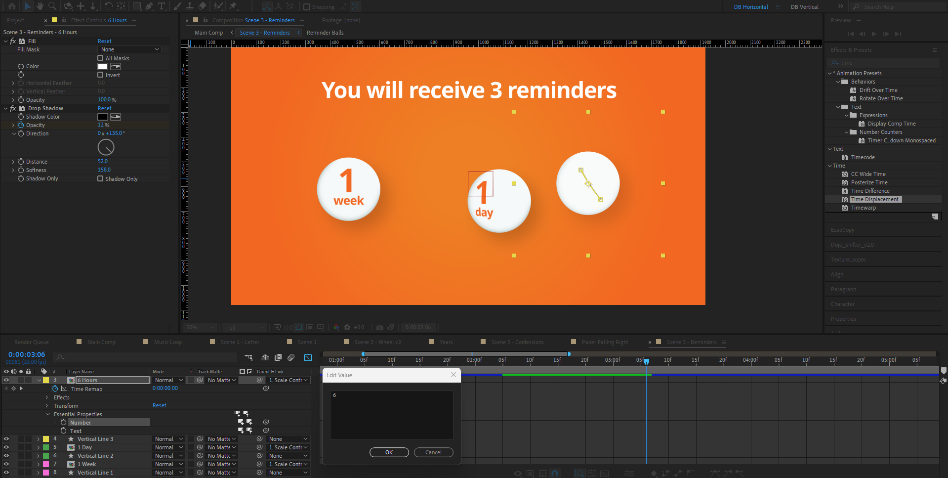 For the wheel, I created three compositions with each of the days, months and years, and then I used the CC Cylinder effect to turn it into a spinning wheel. This wasn’t quite working, so I used the “transformation sandwich” to fix the orientation of it. I also added a Warp effect to the outside wheels to give them more 3D perspective and better fit the plane of view their wheels were in.