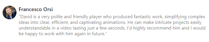 This was a great project to work on as I had a lot of creative control and the client was very friendly and good to work with. Taking the project all the way from scripting to final video gives you a great feeling of ownership of the project and I’m proud of the video I’ve produced. The client was also very happy with the work and was kind enough to leave a LinkedIn recommendation on my profile following it.