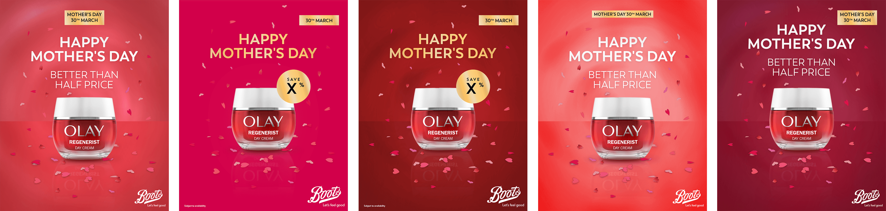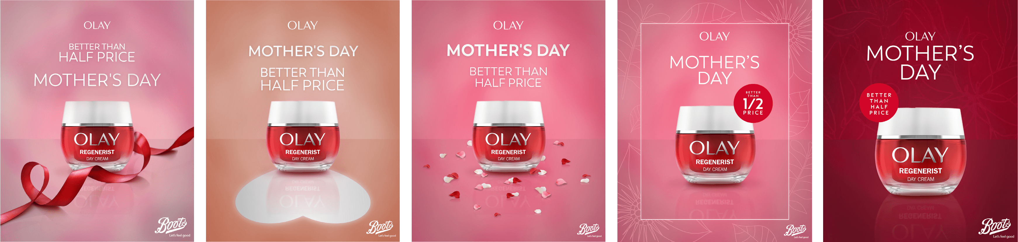 One version featured a ribbon element, another used a large heart-shaped shadow, and another introduced heart shapes scattered on the floor like petals. The remaining options explored background patterns, with one incorporating a border to help frame the product. Across all of the designs, the bottle was placed on a reflective surface, a common OLAY visual, and the copy was adjusted slightly in each version to test different arrangements. These assets were created for use on Boots’ channels as well as OLAY ’s own.